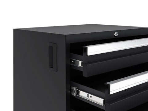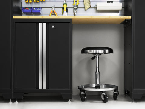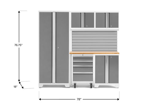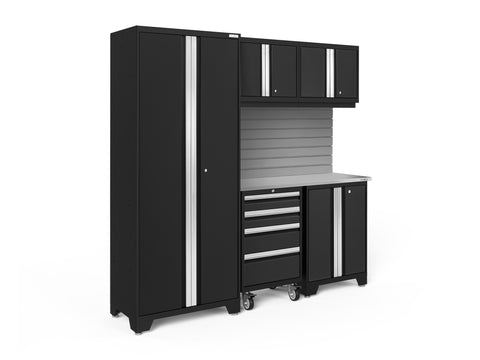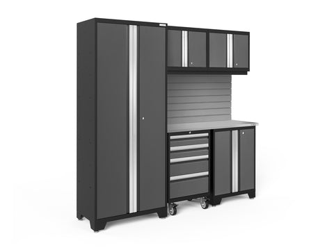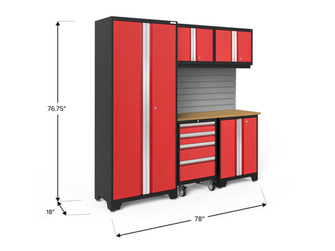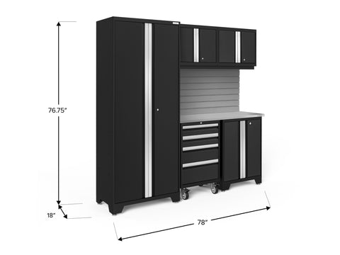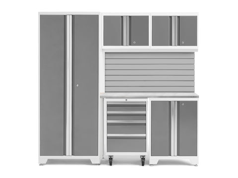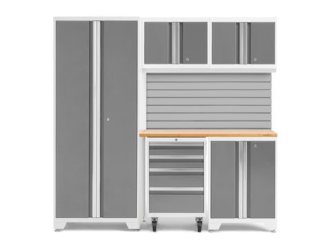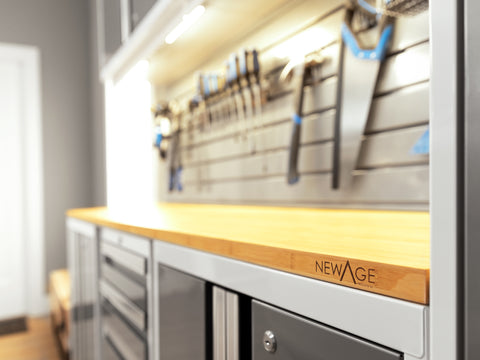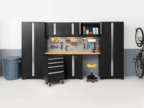 Transform your garage with the NewAge Bold Series 6-Piece Cabinet Set, a compact storage solution designed to meet all your basic garage needs. Built with heavy duty welded steel frames and 24-gauge steel, this cabinet set provides outstanding strength and longevity. The locker cabinet offers a weight capacity of 800 lbs. for storing larger, heavy items and 3 height-adjustable steel shelves to organize gear with removable closet rod included for hanging storage. The base cabinet has a weight capacity of up to 600 lbs. and includes one height-adjustable steel shelf with a cable management access hole to keep your power tools charged. Rolling Tool Cabinet features 4 inch anti-tip casters, giving you a mobile storage solution for your garage. The 4 full-extension drawers on double ball bearing slides keep your tools separated and organized. The wall cabinet provides an off-the-floor storage solution with a weight capacity of up to 100 lbs., perfect for keeping small items neatly stored. Slatwall Backsplash holds up to 150 lbs./sq. ft. Features impact-resistant panels, hidden fasteners, and interlocking design for easy installation. The 48-in. bamboo or stainless-steel worktop offers a versatile space for DIY projects, kids' crafts, and more. This compact garage cabinet set is ideal for organizing everything from sports equipment to gardening tools, and its durable coating ensures long-term protection against everyday heavy use. Get organized and enhance the functionality of your garage with the Bold Series Cabinet System.