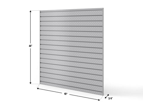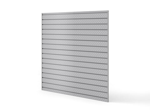 Keep your garage uncluttered, and your tools and equipment off the floor and organized, with NewAge Products premium Steel Slatwall system. Our heavy gauge Pro Series Steel Slatwall panels are impact resistant, with a diamond plate pattern design and silver powder coat paint finish, giving your garage a premium look that PVC or MDF panels just can’t match. The panel features a thickness of 0.5 inches and a material thickness of 1 mm / 0.8 mm, offering a weight capacity of up to 150 lb per square foot. Each 16 square foot slatwall kit includes two 2’ x 4’ panels that can be installed vertically for a stacked wall configuration, horizontally for a long length of tool storage, or on separate walls for area-specific organization. The interlocking panel design makes for a quick installation into wood studs, with hidden fasteners for a clean, perfect look. With 3 in. on-center panels our Slatwall is compatible with NewAge Products Slatwall Accessories and most standard slatwall accessories allowing you to fully customize your storage and organization. Add an accessory kit to your Pro Series Steel Slatwall, for a variety of hooks, baskets and organization options that will make your workspace even more functional.