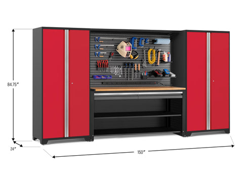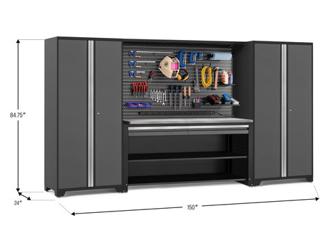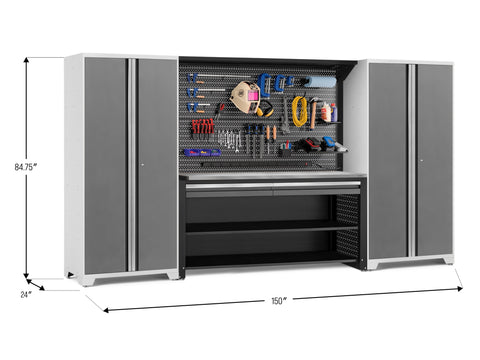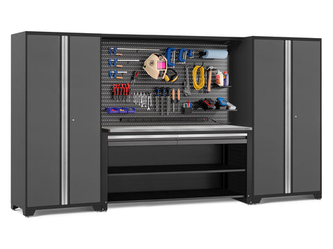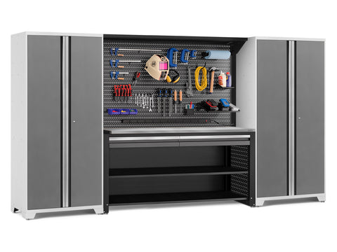 Each NewAge workstation package includes a 2 piece dual pegboard, 1 full length display shelf to attach onto the dual pegboard, 1 height adjustable shelf, 1 fixed shelf, 2 soft closing drawers with drawer dividers, 6 rubber grommets for wire management, 2 side trays with adjustable dividers and height adjustable feet with levelling legs. Worktops and accessory kits are sold separately