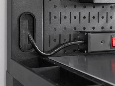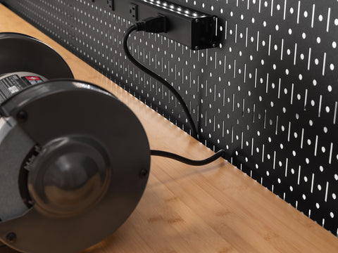 The 0.75in gap at the back of the worktop and pegboard system was created to provide the ultimate wire organization. The 0.75in gap creates an opening to hide away any extra long wires lying around offering a tidy workspace.