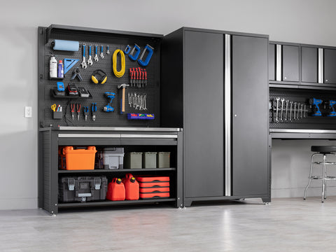 Ultra-strong, easy to install, and adaptable to your space; NewAge Products Pro Series Wall Mounted Steel Shelves offer a versatile way to keep organized, and maximize off-the-floor storage space in your garage.