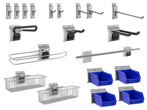 Create an organized and tidy garage space with accessible hooks and baskets designed for use on NewAge Products Steel Slatwall Backsplash, Pro Series Steel Slatwall, PVC Slatwall, and compatible with most 3 in. on-center slatwall systems. The NewAge Products Steel Slatwall 20-Piece Accessory Kit includes an array of snap-in components for holding all of your outdoor gear, from hooks capable of storing heavy tools to Mini Baskets for storing all of your odds and ends. The Paper Towel Holder let’s you tear sheets one-handed for quick tidying, and the Magnetic Toolbar is a great place to store your often-used hand tools, with the magnetic strength to hold pliers, clamps, and screwdrivers. Built with steel for extra strength, and a powder-coat silver gloss finish that looks great in any space, the Steel Slatwall 20-Piece Accessory Kit helps to keep your garage efficiently organized.