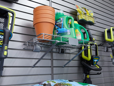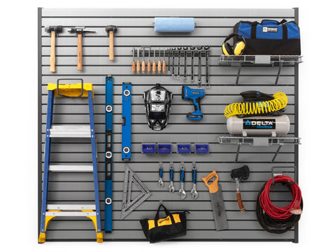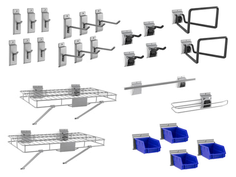 Maximize your slatwall solution with hooks, shelves, and other specialty accessories to keep all your tools and gear organized. Designed for use with the NewAge Products Steel Slatwall and PVC Slatwall options, and compatible with most 3 in. on-center slatwall systems, the NewAge Products Handyman Slatwall Accessory Kit includes everything you need for hanging tools, ladders, levels, saws, extension cords, and more. The extra strong steel hooks keep your smaller hand tools like wrenches efficiently organized. The Magnetic Tool Bar provides a unique solution for organizing your often-used hand tools. Double Hooks are great for storing power tools and flashlights. The Deep Utility Hooks are ideal for keeping your extension cords untangled and easily accessible. The Paper Towel Holder lets you tear sheets one-handed for quick tidying. With a 30 lbs. weight capacity, the 2 ft. Wire Shelves provide storage for buckets and bins. The Blue Parts Bin are great for storing quick grab items like hardware and other small parts. Included in the kit are Parts Bins Support brackets for use on PVC Slatwall. Built with steel for extra strength, and a powder-coat silver gloss finish that looks great in any space, the Handyman Slatwall Accessory Kit is perfect for DIYers looking to store and organize tools and equipment.